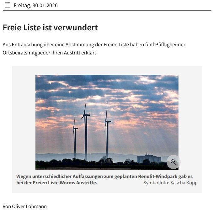 WORMS . Die fünf Ortsbeiratsmitglieder der Freien Liste (FL) aus Pfiffligheim haben vor wenigen Tagen ihren Austritt aus der Wählervereinigung erklärt. Grund für den Austritt sei das Abstimmungsverhalten der Freien Liste im Wormser Stadtrat, die sich gegen die geplanten Windräder des Industrieunternehmens Renolit ausgesprochen hatte. Dieses Votum war bei den Pfiffligheimer Mitgliedern auf Unverständnis gestoßen. Die Freie Liste zeigt sich nun verwundert über den Schritt der Pfiffligheimer.